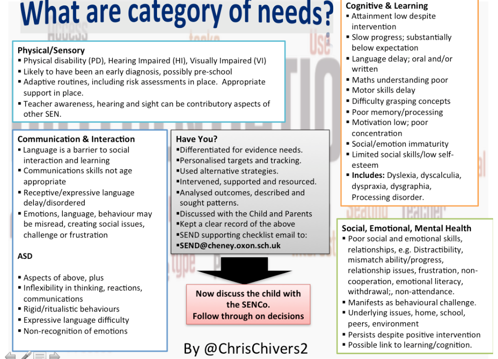 *UPDATE March 2019* This table is being updated/changed. Post originally written in 2013 by a SENCO in my old school. Lots of changes needed to the columns now upon reflection. Please note that the strengths section in MLD is empty because their strengths are just like any ‘other’ student, so I don’t feel it needs […]