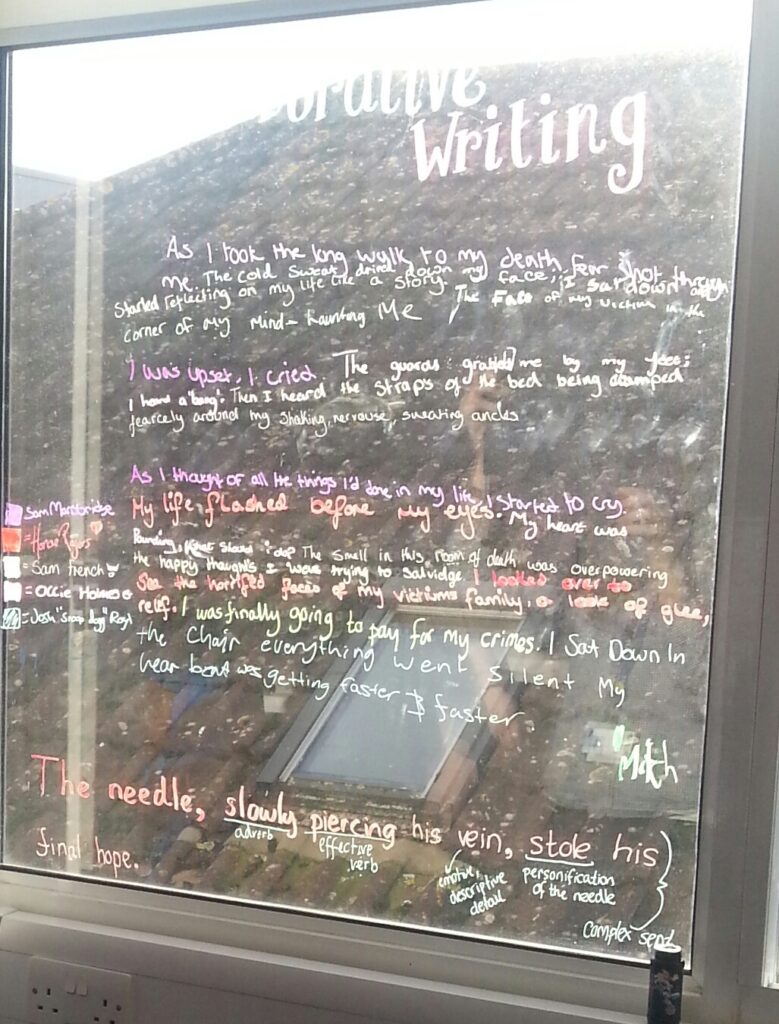 Resources: Liquid chalk pens… (Can also be found on eBay/Amazon at a good price) Task: Students writing on windows- or any glass surface!! The pens are easy to wipe off and come in a variety of colours! You can use your windows to add revision topics/key words/specialist language and so on… but why? Students enter and […]