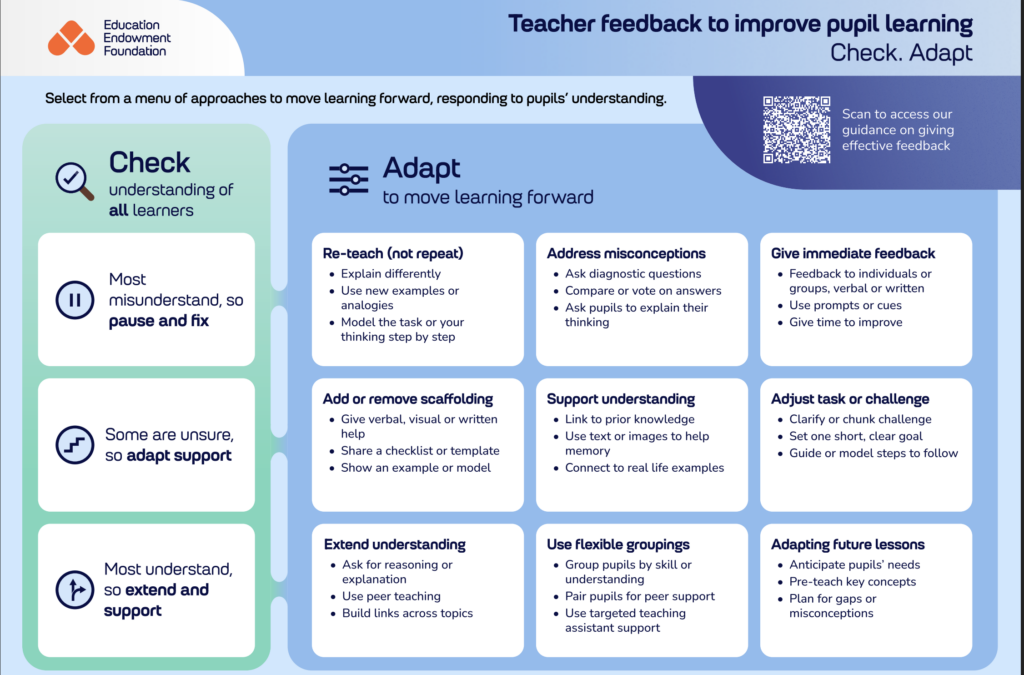 👉 Checking for Understanding that Leads to Action (EEF, 2025) — https://educationendowmentfoundation.org.uk/news/checking-for-understanding-that-leads-to-action-adaptive-teaching