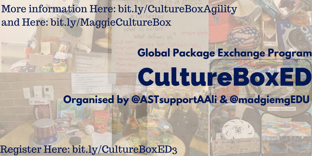 So, the idea is simple; Click here for a Google form asking for your details/location/students ages. It will also ask for the culture of the #CultureBoxED you would like to share/receive!