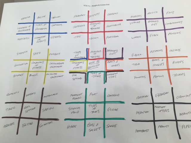 Place 9 naughts and crosses grids on an A3 sheet of paper. In the centre grid identify 8 topic areas to revise and in the middle box a title or key topic area. Each topic area identified in the middle grid corresponds to one of the other 8 naughts and crosses grids. Pupils then have to place in each box a key word or term related to that topic area. This can be used as a retrieval activity or revision activity of key words. Pupils can then peer assess and add anything missed.