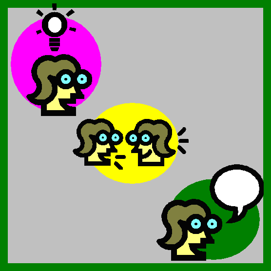 Next, they pair up with another student and discuss their ideas for 1 minute. They then join up with another pair to make a square to share their ideas for 2 minutes.